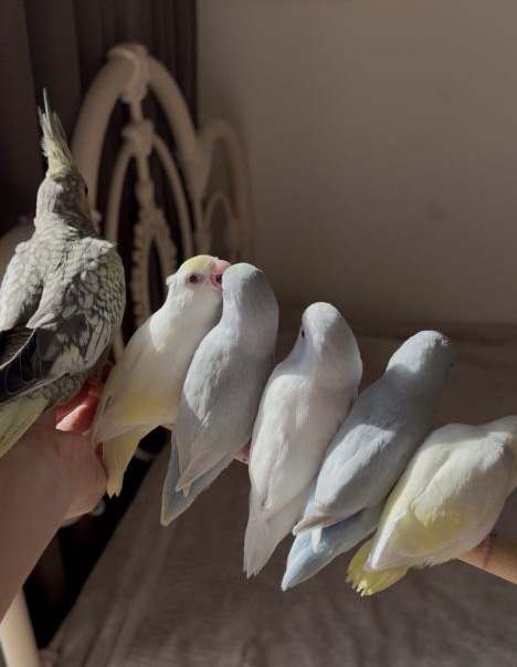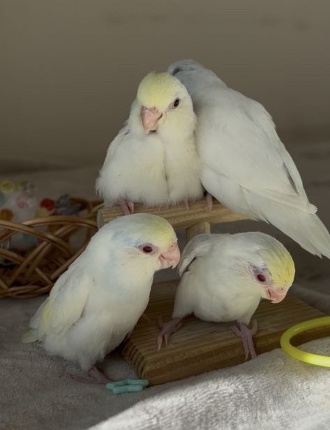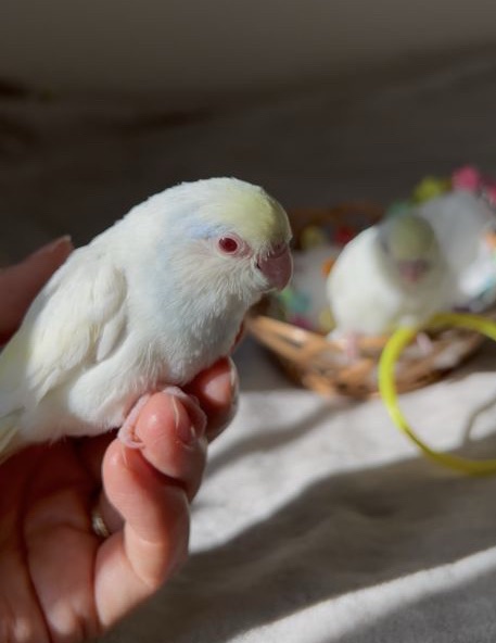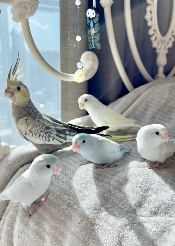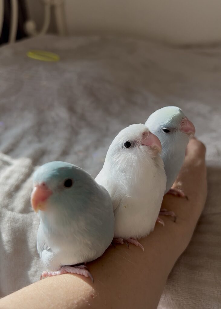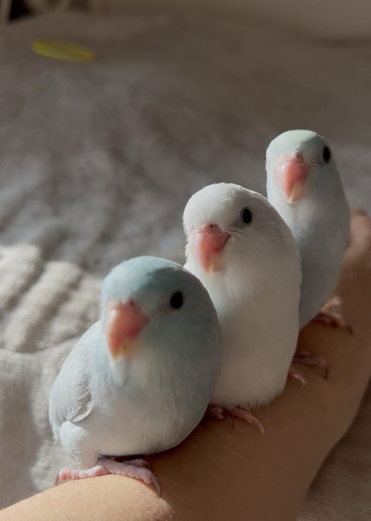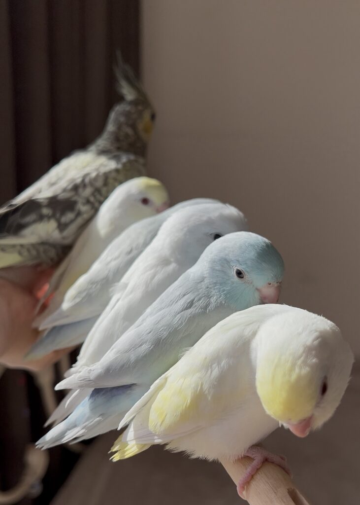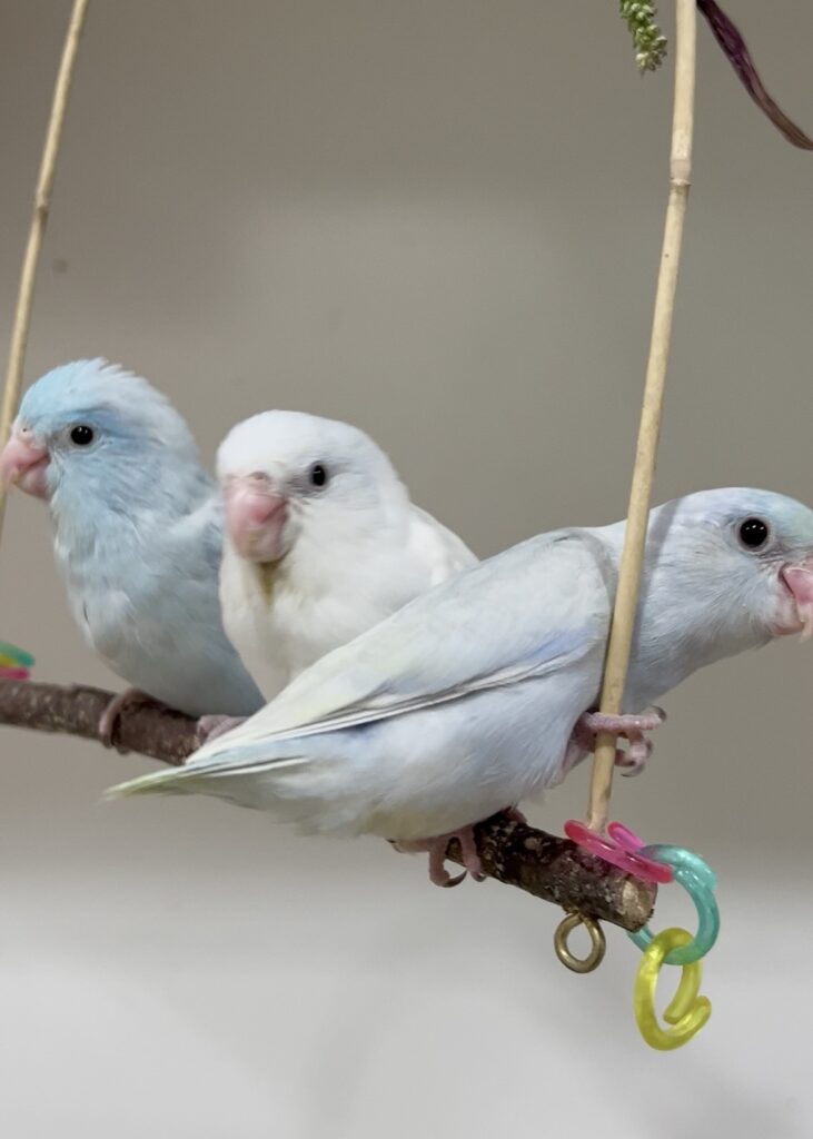 みんな挿し餌終了したてでお世話しやすくなっています。Birdy Haniでは羽切りはしませんので皆飛べますが、呼び戻しできるよう練習をしています。(個体差アリですが、基本的にまとわりついてくる子ばかりです。)